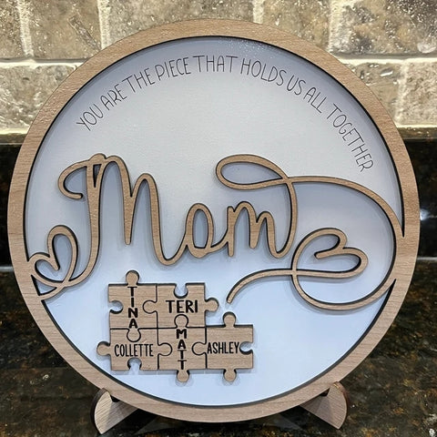 Personalized table desk wall decor can be customized with mom and children's names on the pieces of puzzle. Mom is like a puzzle piece in the middle. Holding all family members together. Show your love for Mom by customizing this home decor for Mom on Mother's Day.