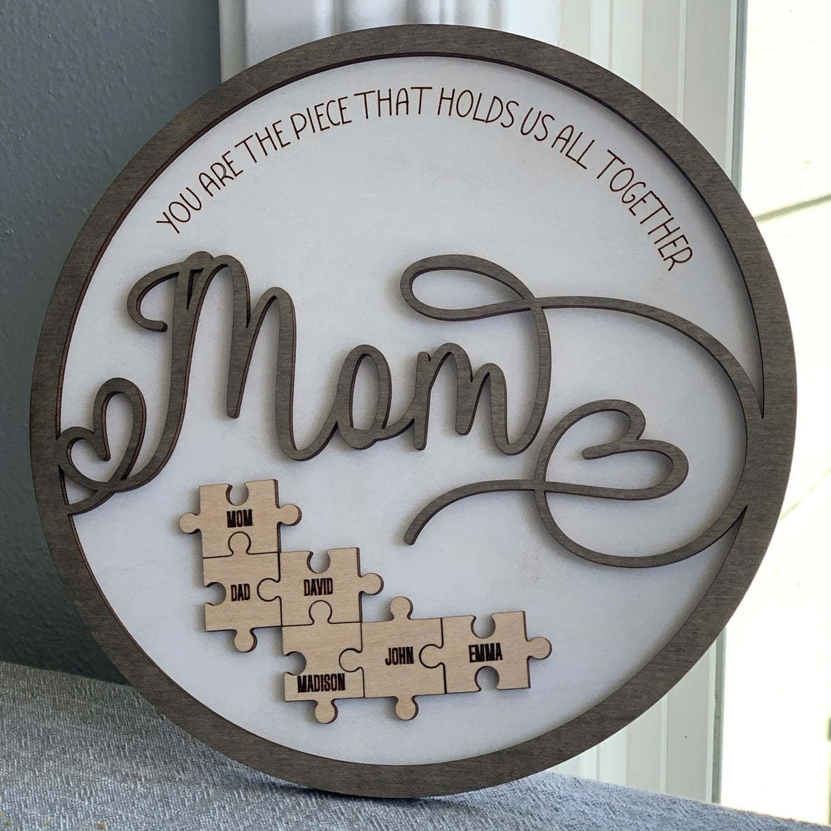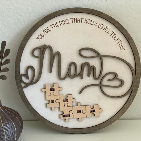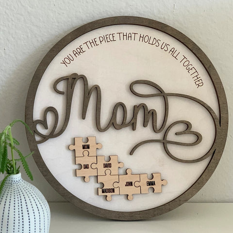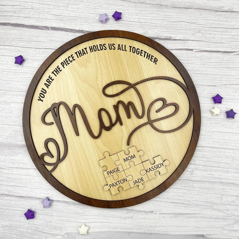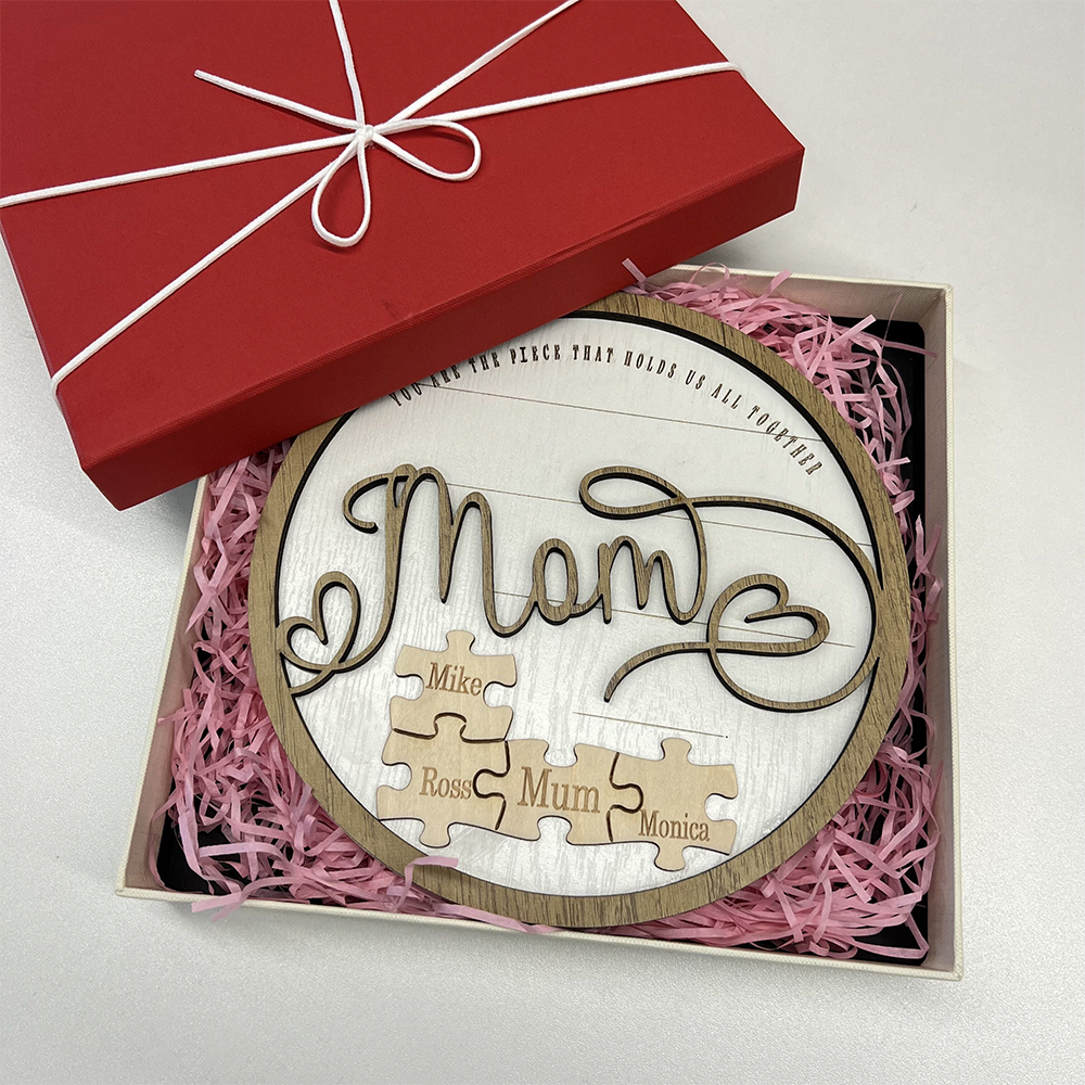 Mom is like a puzzle piece in the middle. Firmly connecting the family together. customize this custom wood name puzzle sign gift. Engrave the names of family members on the puzzle. And give it to Mom as a gift. (Up to 6 small puzzle pieces can be customized)