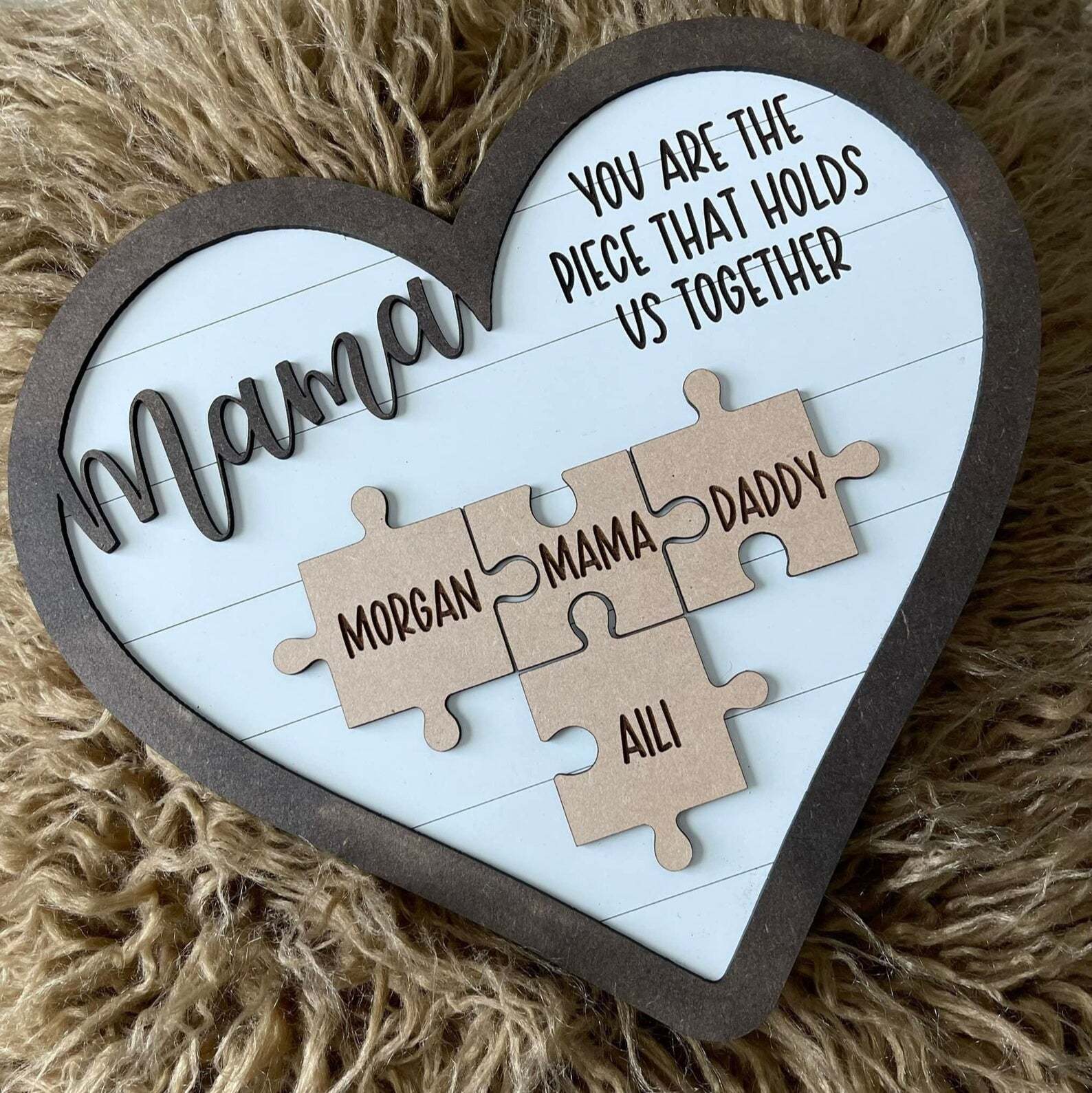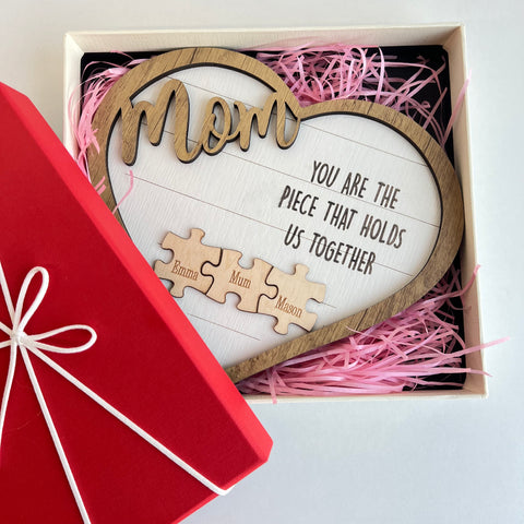 Mom is like a puzzle piece in the middle. Firmly connecting the family together. customize this custom wood name puzzle sign gift. Engrave the names of family members on the puzzle. And give it to Mom as a gift. (Up to 6 small puzzle pieces can be customized)