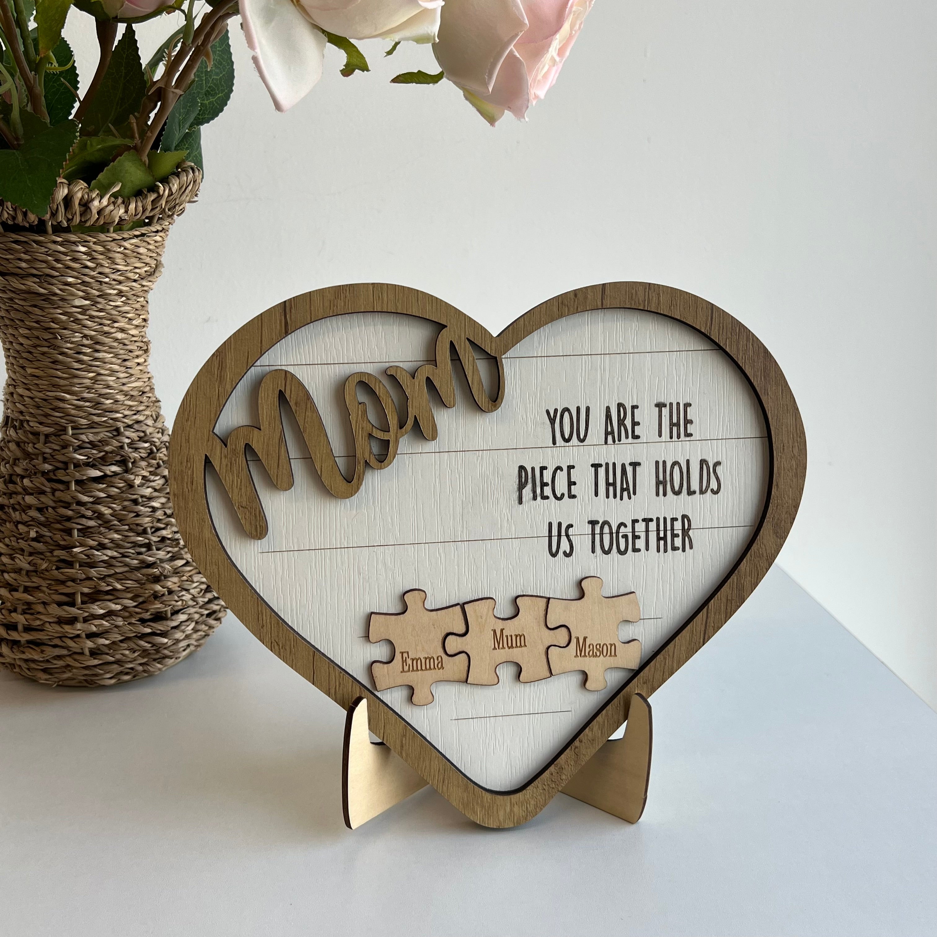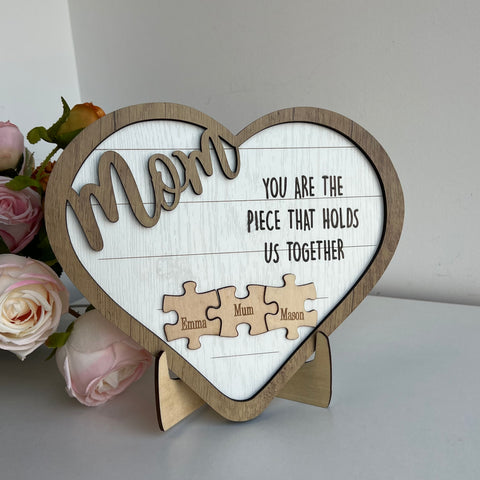 Personalized table desk wall decor can be customized with mom and children's names on the pieces of puzzle. Mom is like a puzzle piece in the middle. Holding all family members together. Show your love for Mom by customizing this home decor for Mom on Mother's Day.