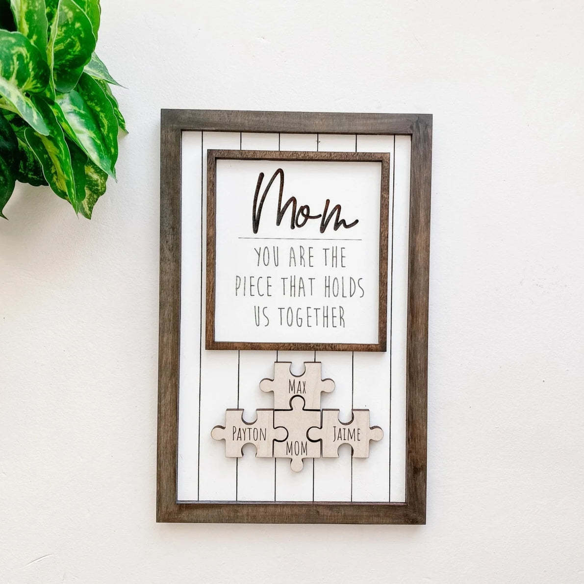 Mom is like a puzzle piece in the middle. Firmly connecting the family together. customize this custom wood name puzzle sign gift. Engrave the names of family members on the puzzle. And give it to Mom as a gift. (Up to 6 small puzzle pieces can be customized)