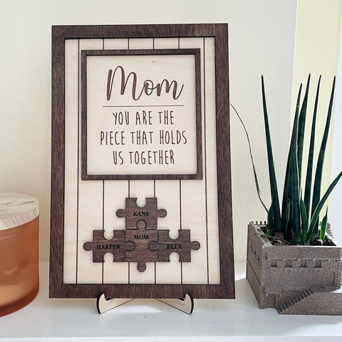 Personalized table desk wall decor can be customized with mom and children's names on the pieces of puzzle. Mom is like a puzzle piece in the middle. Holding all family members together. Show your love for Mom by customizing this home decor for Mom on Mother's Day